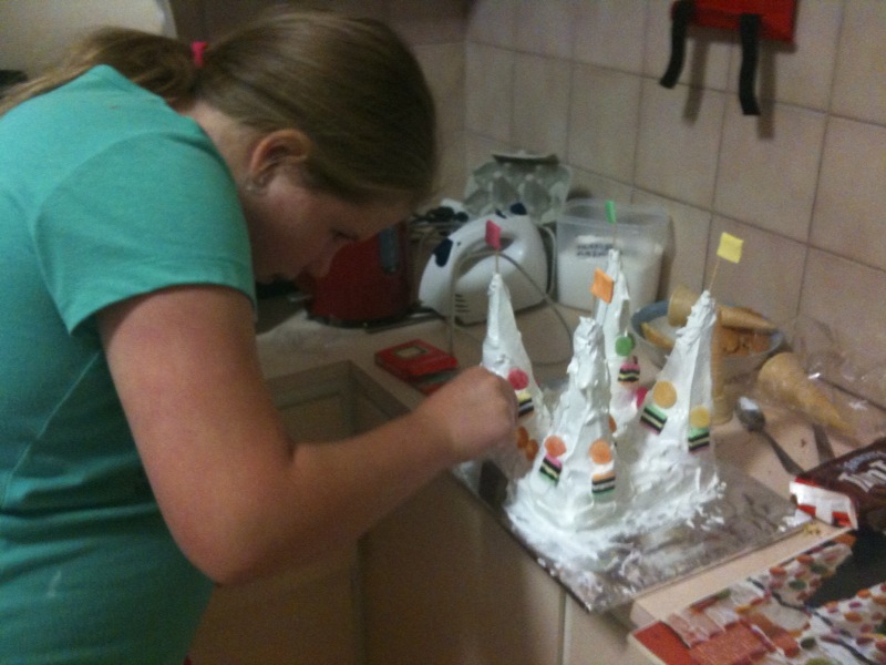 Changes to the recipe: find a freakin doll to use instead of a real egg! Also, I chose to use multicoloured smarties instead of freckles or hundreds and thousands for the path – I had them on hand and there's no associated mess.